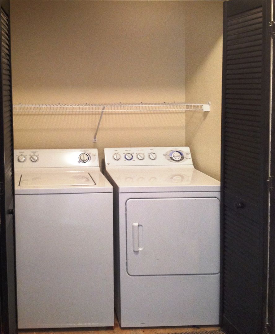 The kitchen is equipped with a tiled backsplash, granite countertops, and stainless steel appliances. Rent includes a full-size washer and dryer, as well as cable and internet.